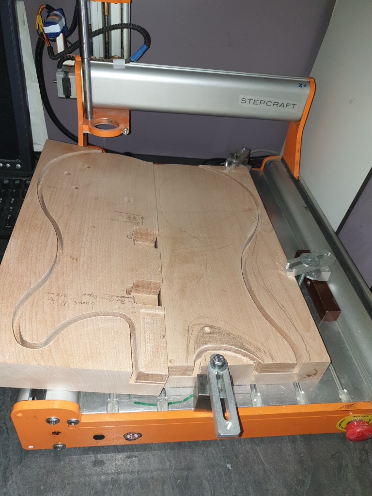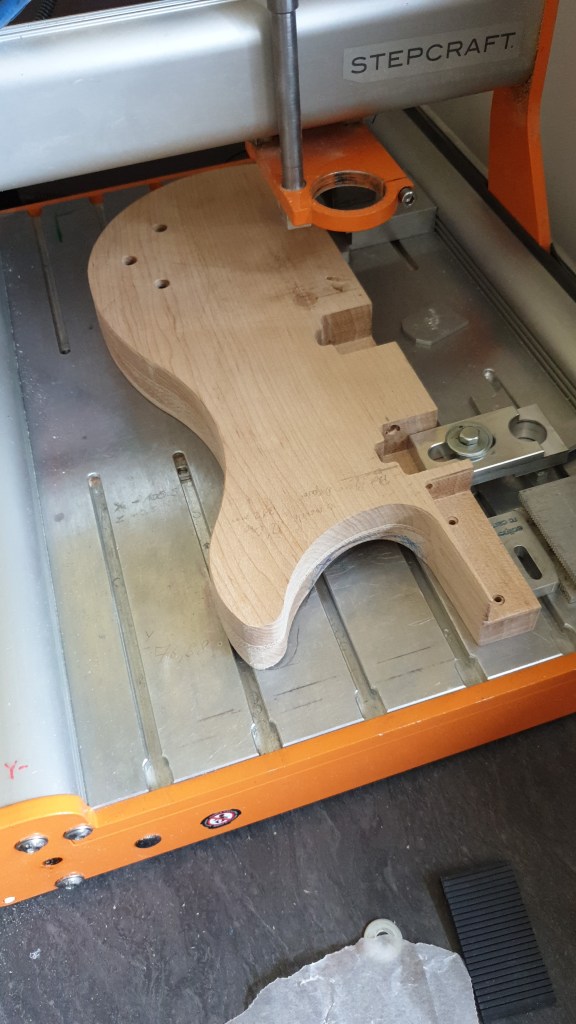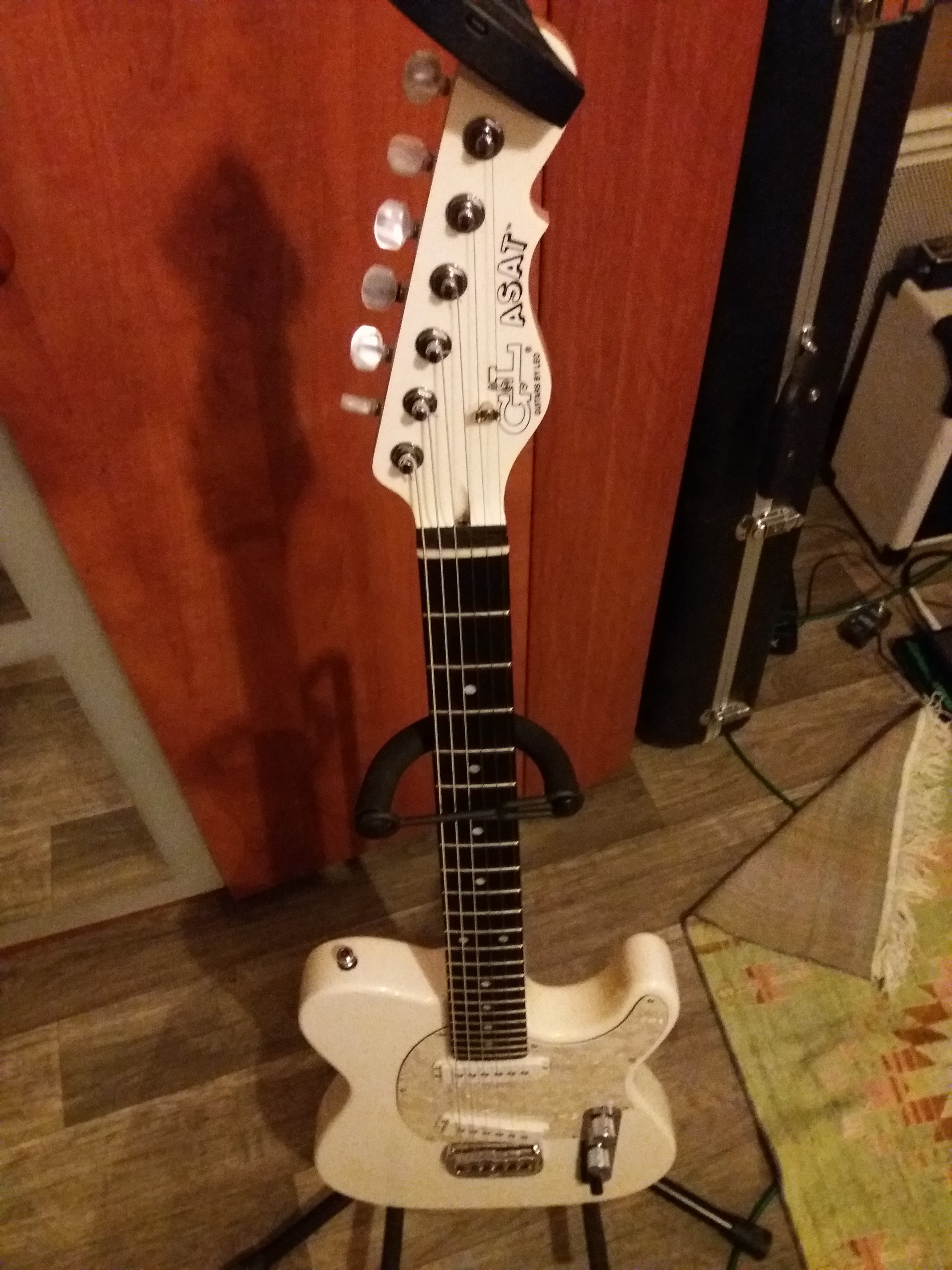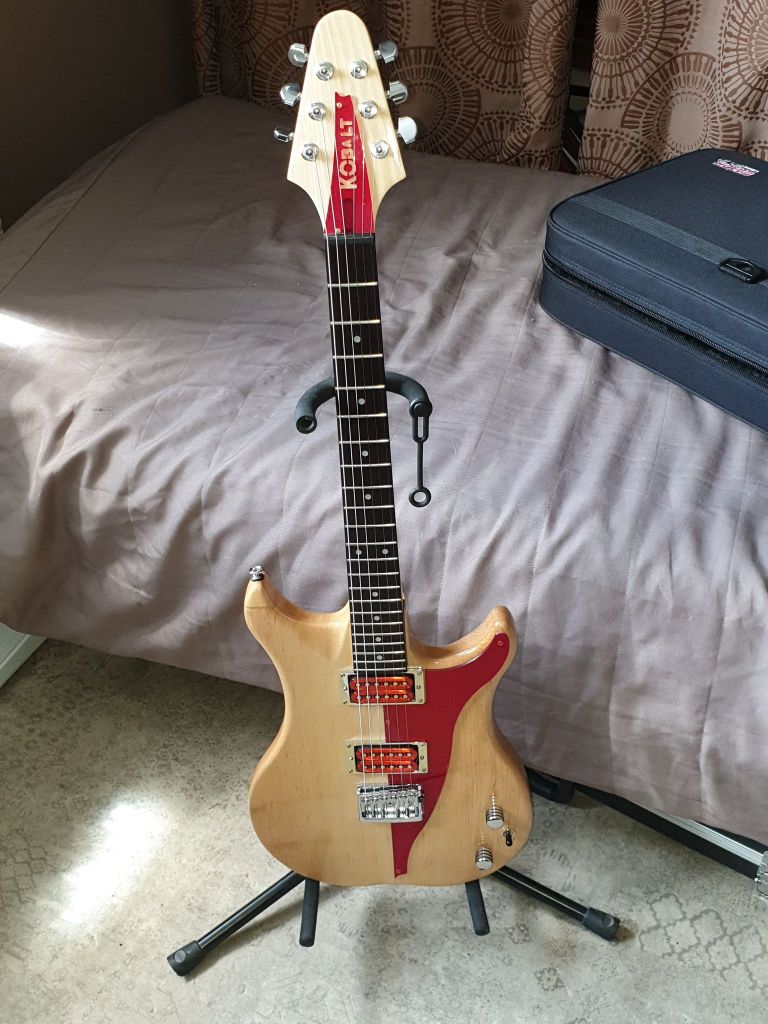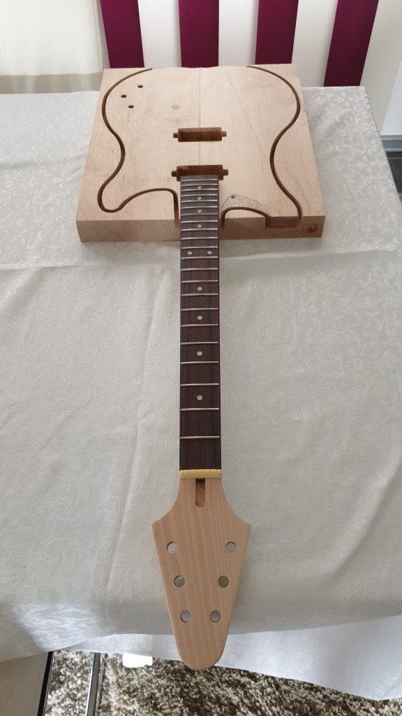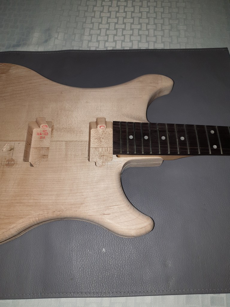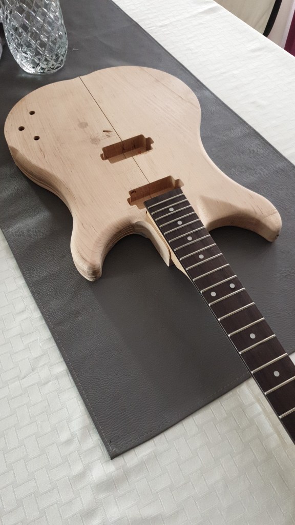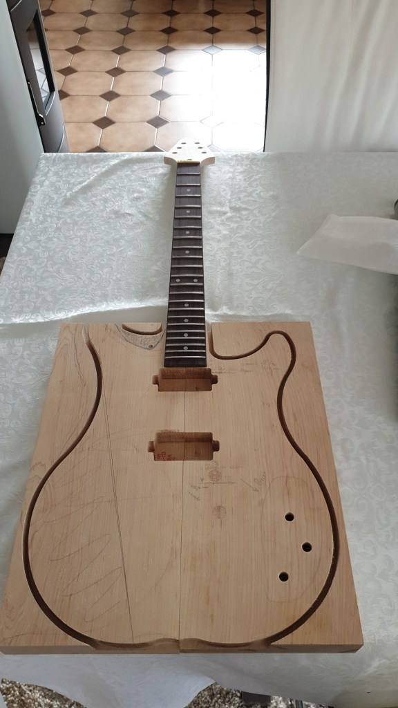 Voici donc ma dernière réalisation. C’est une guitare électrique. J’en joue avec plus ou moins de succès (plutôt moins)