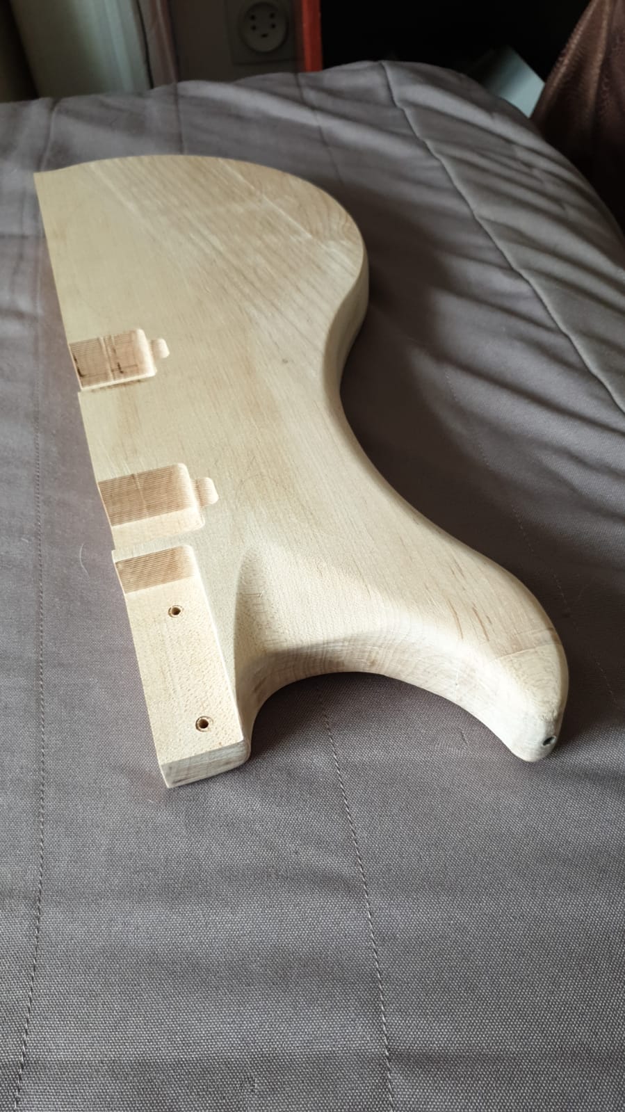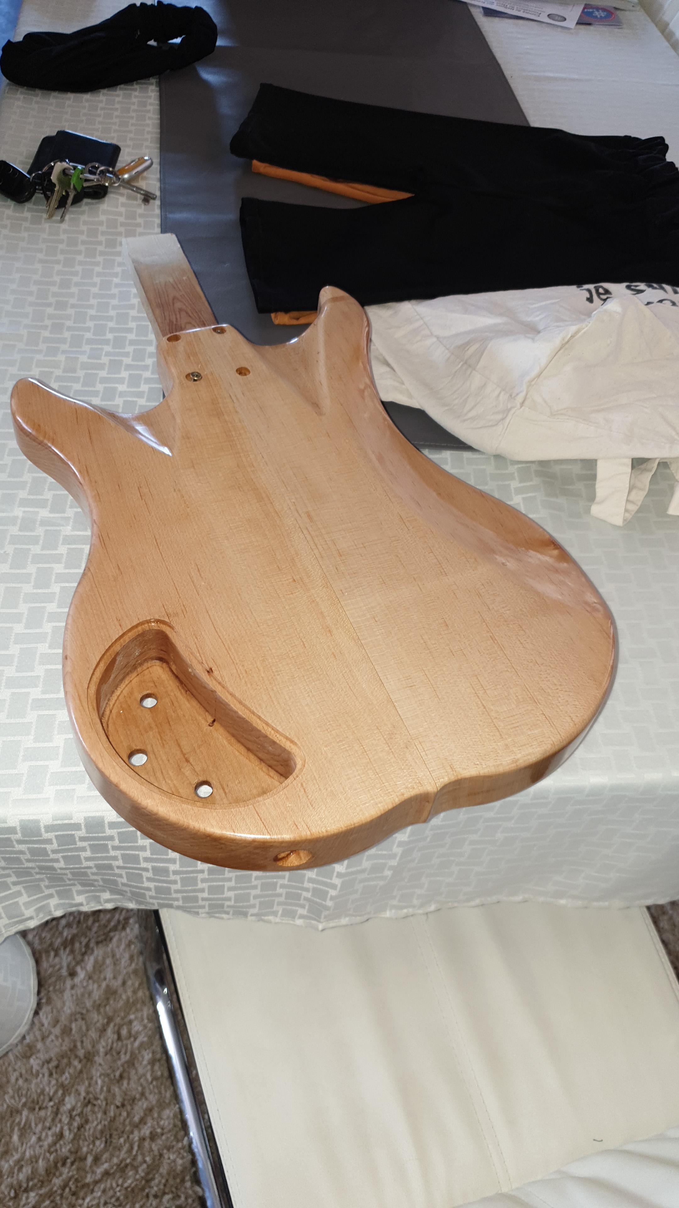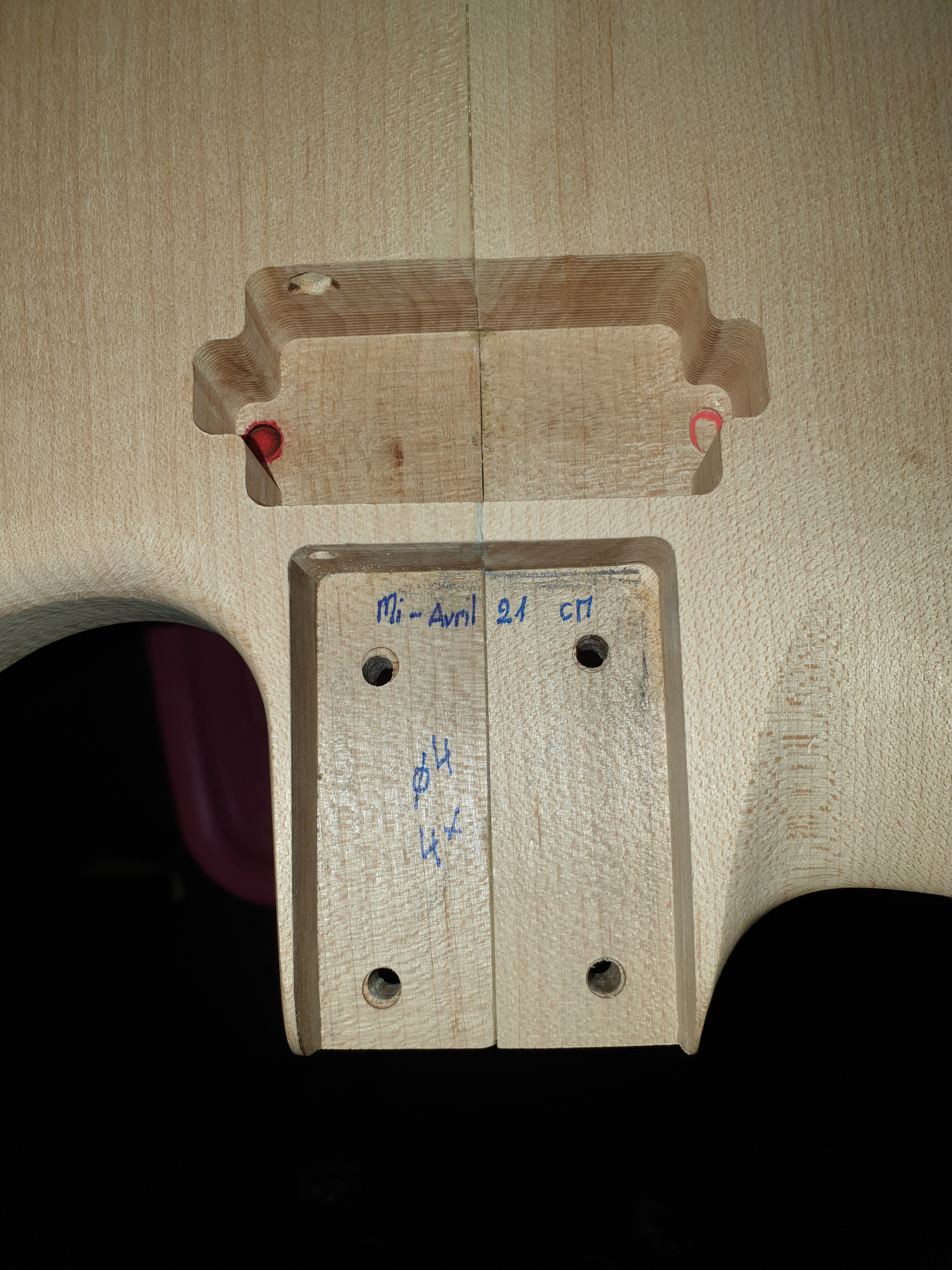 L’ensemble des fournitures est monté à une somme d’environ 500 euros en valeur neuve. La plupart des objets ayant été achetés d’occasion moitié prix. Le bois du corps par exemple en Erable Français était voué aux poubelles d’un grand atelier d’aéronautique dans mon coin. Disons que je l’ai sauvé non pas de la mort mais en quelque sorte ce bois à une seconde vie. Et vue la qualité de ce bois ce n’est que justice.